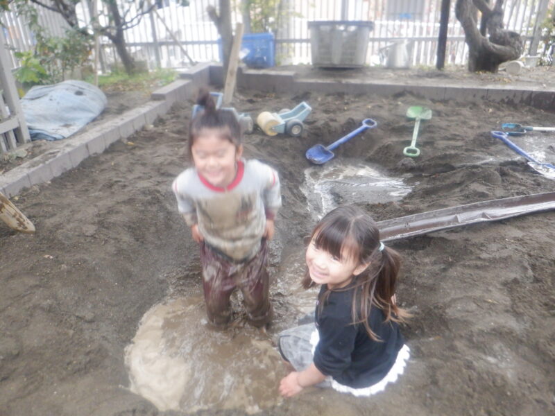 子どもにとって遊びとは生きることそのものです。余暇とは違います。『自由遊び』は『自発的な遊び』です。子どもたちが自ら考え「やってみよう!」と思ったことに取り組みます。幼稚園では子どもの思いを十分に実現できるよう、教師はサポートしています。お家ではなかなか出来ない泥遊びや絵の具遊びも思う存分楽しむことが大切だと考えています。『自発的な遊び』だからこそ玩具の取り合いなど喧嘩も起こります。それも大事なことであると捉えています。