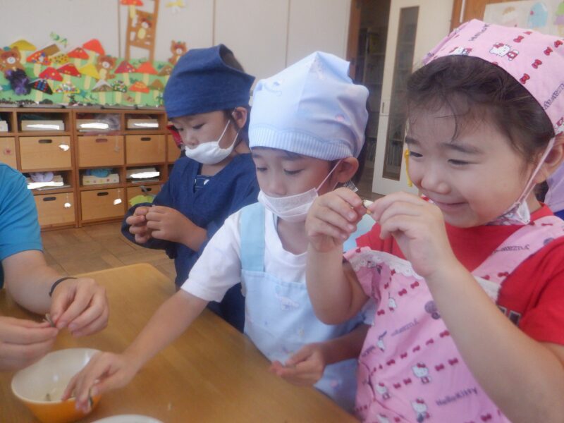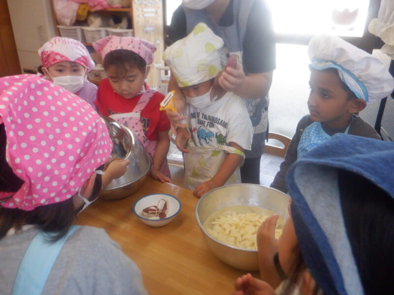お芋掘りで掘った美味しいお芋で、ちゅうりっぷ組のお友だちはおいしいお料理をするようです。