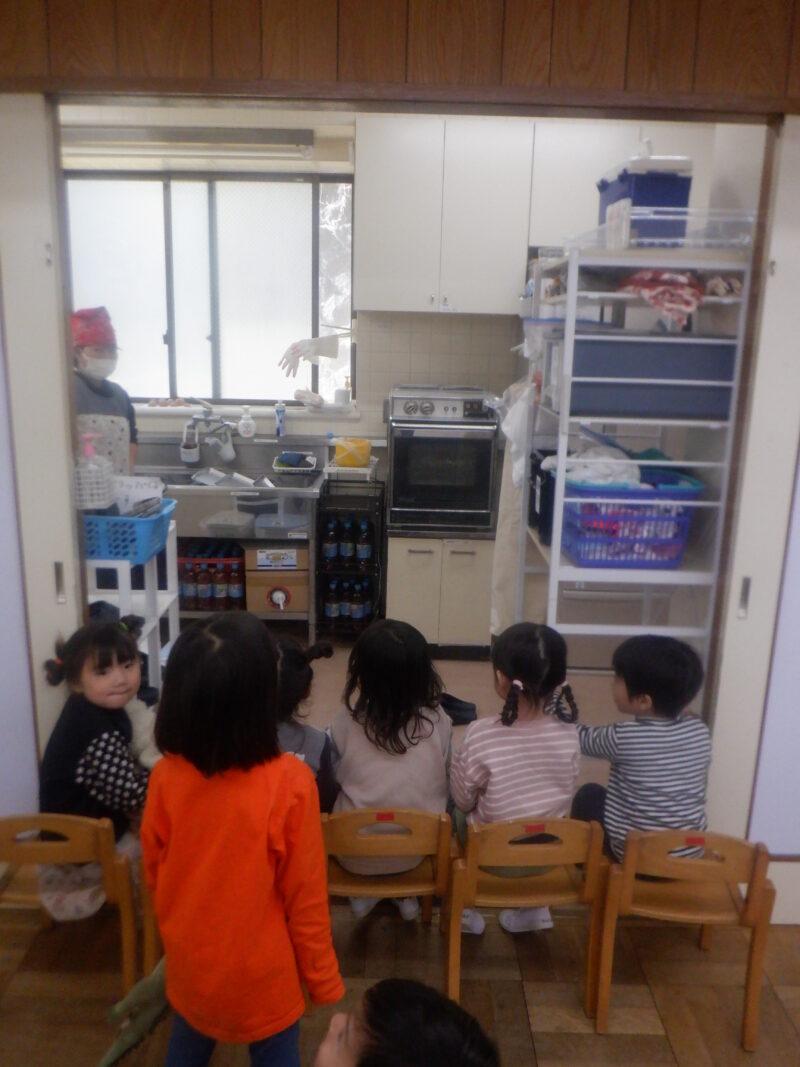 それからいつ出来上がるかなぁとキッチンの前に椅子を持って来て座っています。