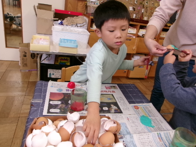 さくら組ではたくさんの卵の殻を集めて、何か良いものを作るようです。
