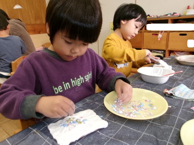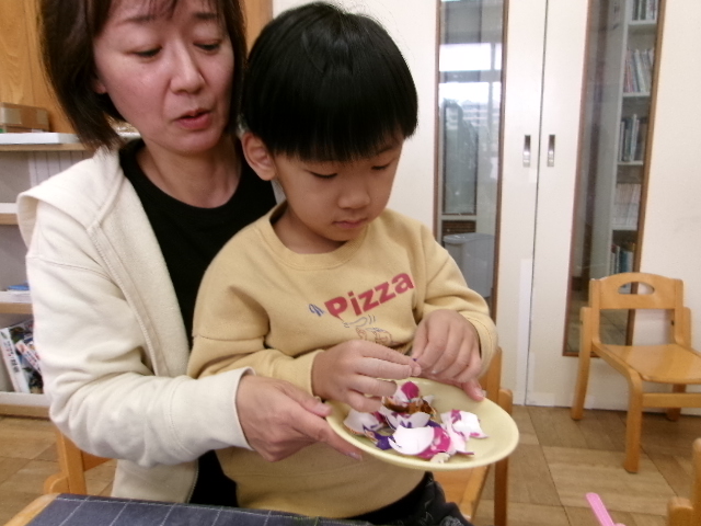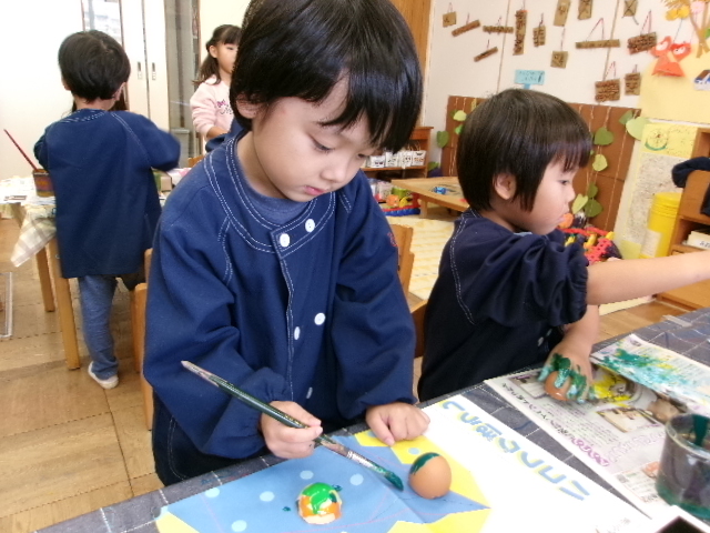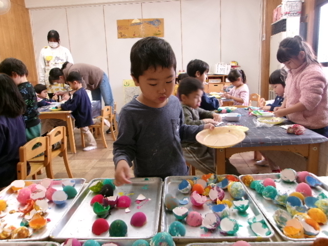 そして紙粘土の上に色とりどりの卵の殻を貼っていきました。