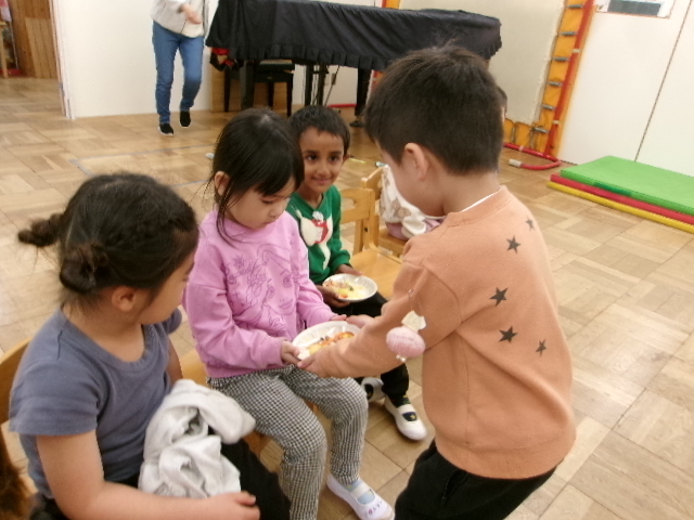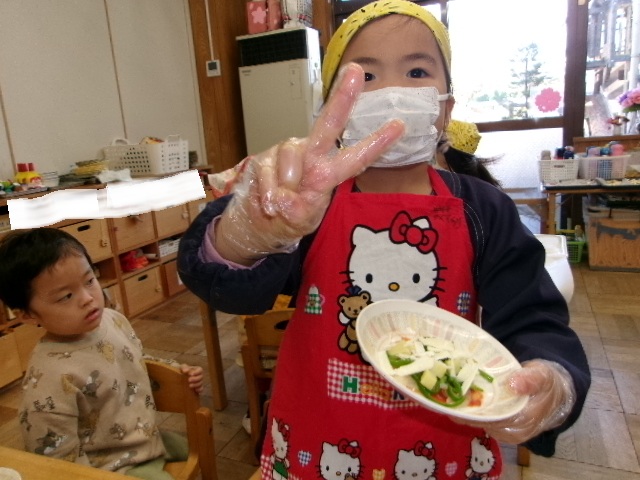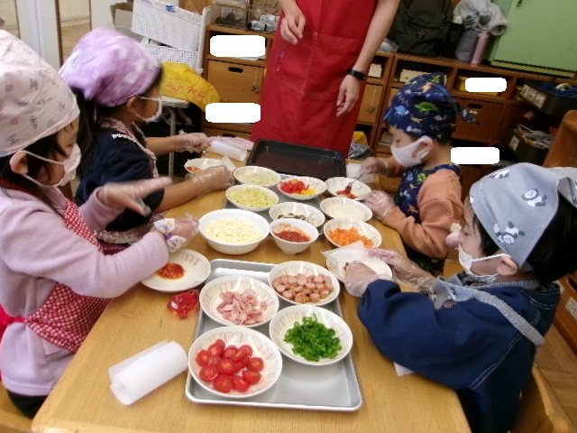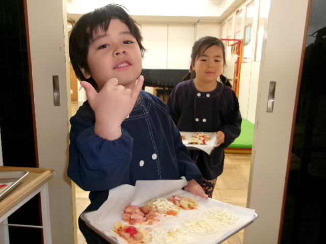 ピザはとても美味しく出来上がりました。体に良いピザをみんなにも食べてもらおうとピザ屋さんを開きました。ちゅうりっぷ組さん、ゆり組さんも美味しく食べてくれました。