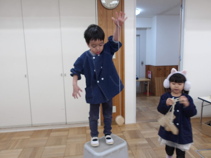 園内にはお正月遊び(伝承遊び)を用意ししています。子どもたちはそれに気づき、触れてやってみて楽しんでいます。