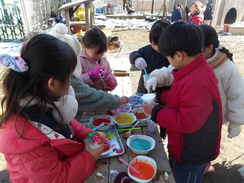 この日は今年度最後のチームの日。最後のチームの日になるから何をする??と各チーム相談していました。雪遊びをしたい!と言っていたチームは本物の雪が降り大喜びです!