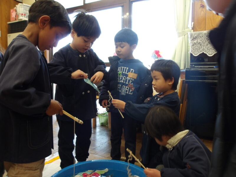 もう一つのチームは魚釣りです。本物の水の中にみんなで作った魚の絵を浮かべ楽しみます。