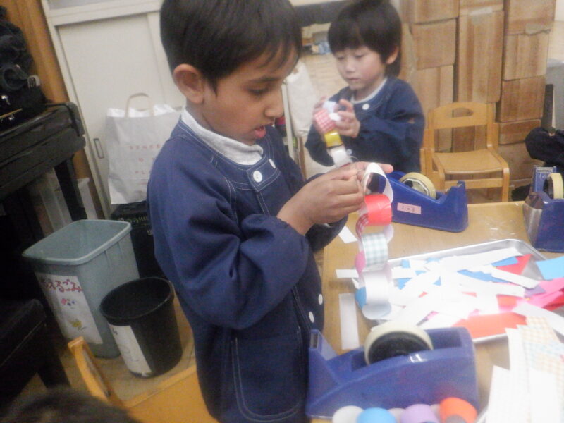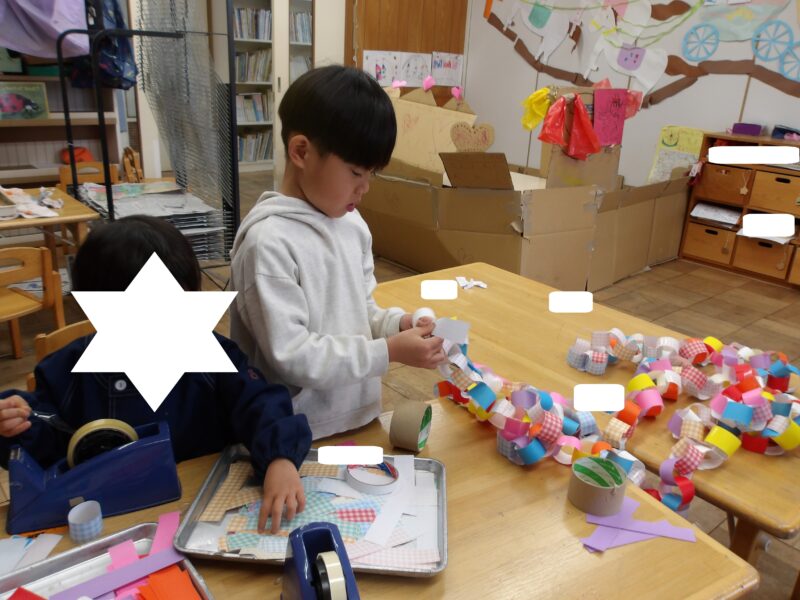 飾りもあったらいいねと子どもたちと考え、みんなで輪飾り作りをしています。