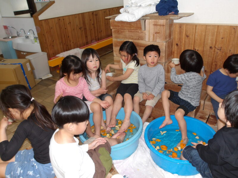 ボールプールの後は前に遊んで楽しかったみかんの足湯。